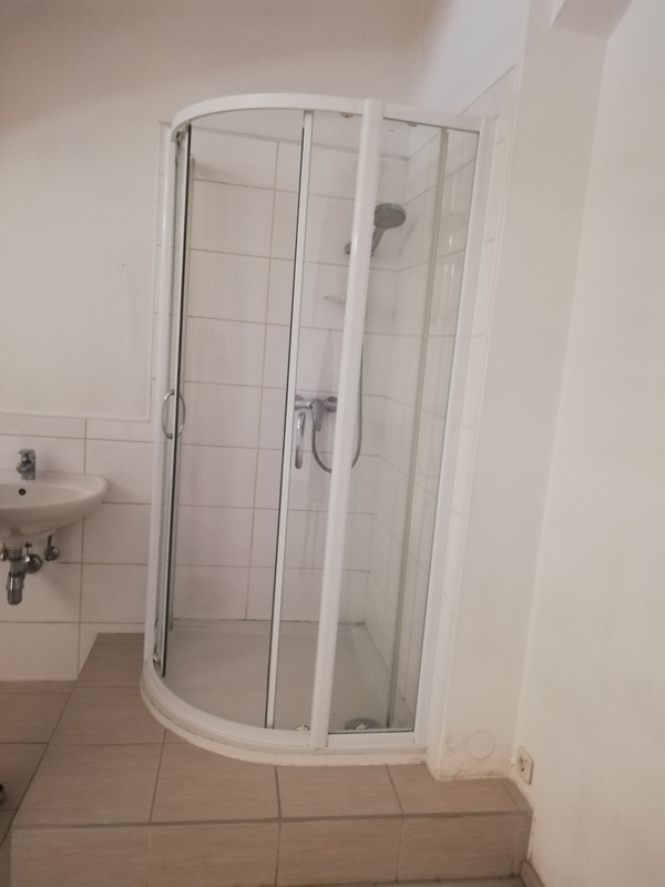 Ebenerdig, also barrierefrei, gelangt man in den durch eine Trennwand in 2 Räume geteilten Verkaufsraum mit einer kleinen Theke, Anschlüssen für eine Teeküche, Toilette – und im zweiten Bereich einer Dusche. Durch eine Glastüre betritt man den zweiten , großen Raum mit Wasseranschluss und Toilette. Von diesem aus gelangt man in den Innenhof des wunderschönen alten Stadthauses, in dem sich unser Lokal befindet.
