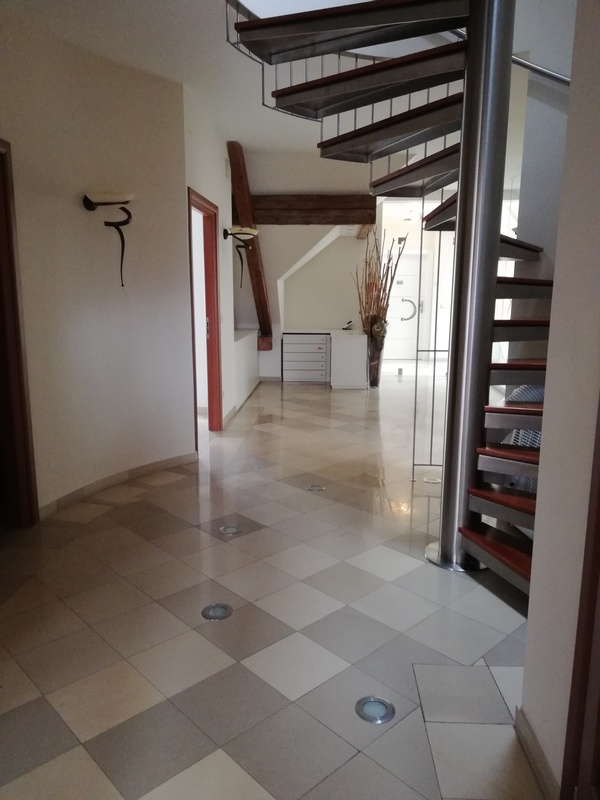 Über eine gediegene Wendeltreppe gelangt man in das Obergeschoß, bzw. das Dachgeschoß, des Hauses mit seinen wunderschönen, repräsentativen Holzbalken, in dem sich weitere kleine Stauräume sowie ein Badezimmer mit Dusche und WC befinden.