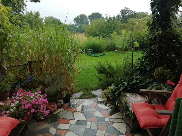 in den ruhig gelegenen Garten sowie die uneingeschränkte Fernsicht ins Grüne. Die Fernsicht kann durch das an das Grundstück angrenzende Retensionsbecken nicht verbaut werden und bleibt dem neuen Eigentümer in jedem Fall erhalten!